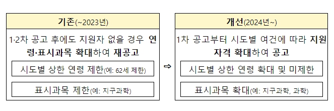 교육부는 2023년 12월 27일, 계약제 교원 채용의 어려움을 해소하기 위해 지원 자격 범위 확대 등 채용 요건 완화를 시도교육청에 협조 요청했고, 1월 23일 현장 안착을 위한 점검 회의를 개최했다. 이에 따라 시도별 여건에 맞게 지원 가능 연령 확대 및 미제한과 표시 과목 확대 등 지원 자격을 첫 공고부터 완화하여 계약제 교원을 채용할 수 있게 됐다.