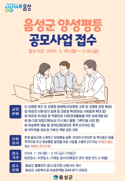 ![]() 음성군, 양성평등 실현을 위한 참여 민간단체 공모 |