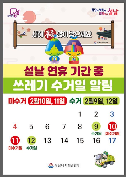 설 연휴 기간 중 2월 9일과 12일은 생활폐기물을 정상 수거한다.