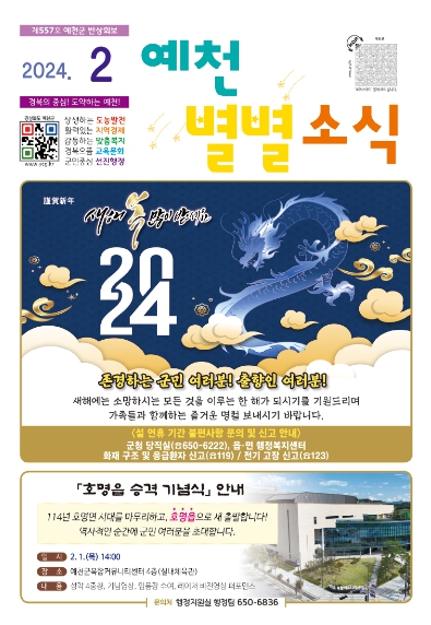 ‘예천별별소식’ 2월호에는 ‘야생동물 피해 예방시설 설치 지원사업, 농업인 지원 보험 가입 안내, 아동발달지원계좌 가입 안내’ 등 각종 지원사업과 ‘갑진년 정월대보름 달집태우기 행사, 군민디지털 역량 강화 교육’ 등 군에서 진행하는 교육과 행사들에 관한 정보가 상세하게 실렸다.