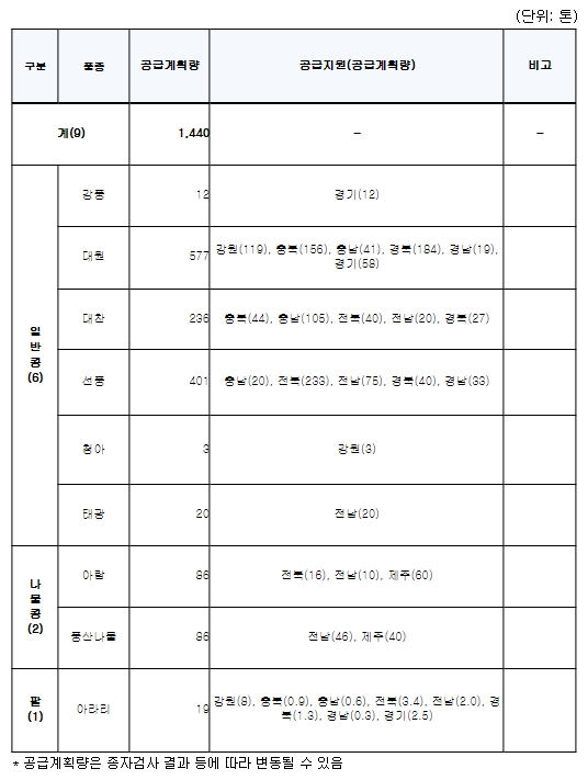2024년에 공급하는 콩·팥 보급종은 일반(장류)콩 6품종 1,249톤(강풍 12, 대원 577, 대찬 236, 선풍 401, 청아 3, 태광 20), 나물콩 2품종 172톤(아람 86, 풍산나물 86), 팥 아라리 19톤으로 총 1,440톤이다.