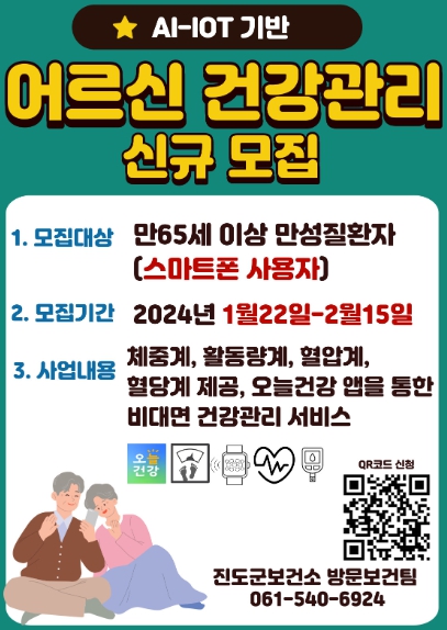 ![]() 진도군, 2024년 ‘인공지능-사물인터넷(AI-IoT) 기반 어르신건강관리사업’ 대상자 모집 |