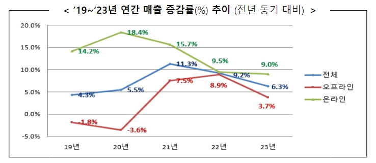 오프라인은 대형마트(0.5%), 백화점(2.2%), 편의점(8.1%), 준대규모점포(3.7%) 등 전 업태에서 증가세를 보이면서 매출이 3.7% 증가했고, 온라인도 매출이 9.0% 증가했다. 다만, 코로나 이후 일상회복의 영향으로 줄어들었던 온·오프라인의 매출 증가폭 차이는 다시 벌어지는 것으로 나타났다.
