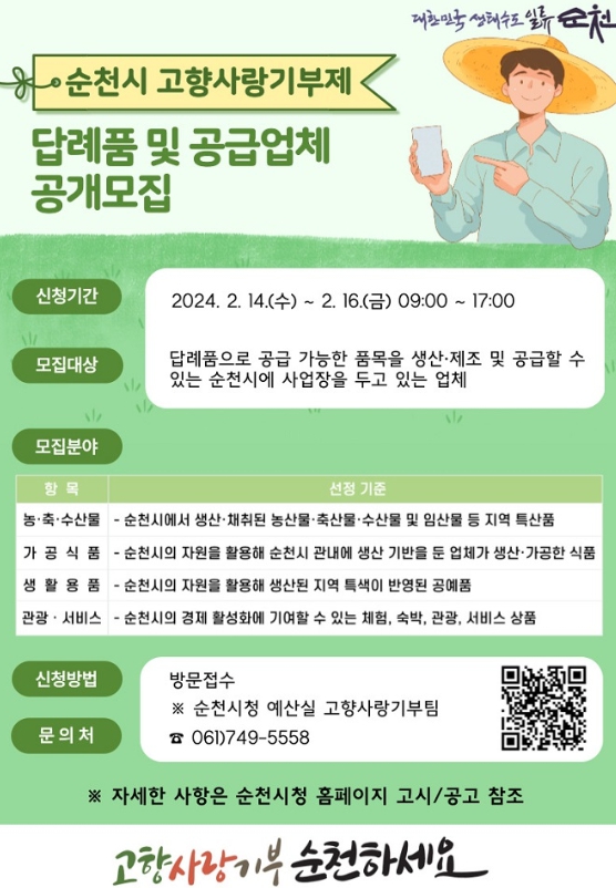 공개모집 내용은 오는 31일부터 2월 16일까지 시 홈페이지를 통해 공고되며, 신청 기간은 2월 14일부터 16일까지이다. 답례품을 제안하고 공급을 원하는 업체는 순천시청 예산실 고향사랑기부팀으로 방문해 신청 서류를 제출하면 된다.
