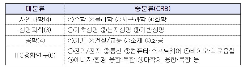 ![]() 한국연구재단 「기초연구본부 학문단별 분류체계」에 따른 책임전문위원(CRB, 중분류) 17개 분야 |