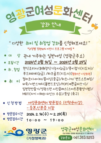 ![]() 영광군, '2024년 상반기 여성문화센터 프로그램'수강생 모집 |