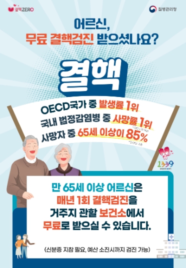 보건소 관계자는 “면역력이 약한 65세 이상 어르신의 경우 결핵에 취약하므로 아무 증상이 없더라도 연 1회 결핵 검진을 꼭 받아야 한다” 당부했다.