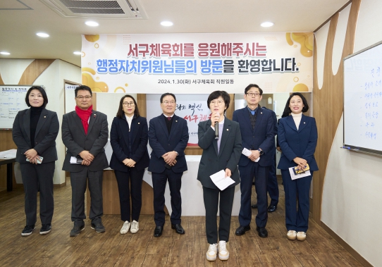 이날 현장방문에는 행정자치위원(신혜영 위원장, 박용준 부위원장, 서다운·오세길·정홍근·신현대·최지연 위원)과 소관사업부서 관계 공무원 등 10여 명이 참석하여 사무실 이전 상황을 확인했다. 이어 체육회의 2024년 주요업무와 추진계획 등에 대해 보고 받고, 개선사항과 운영상의 애로사항을 청취하는 등 서구 생활체육의 현안에 대해 소통하는 시간을 가졌다.