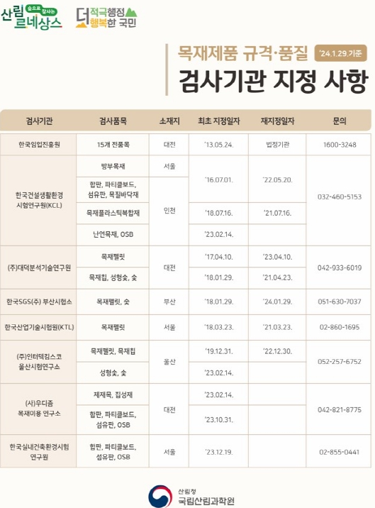 국립산림과학원은 '목재이용법'에 따라 국내에서 생산되거나 수입하여 유통되는 15개 목재제품에 대하여 규격‧품질 검사를 할 수 있는 검사기관을 지정하고 있다.