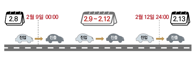 통행료 면제 기간 및 대상은 2월 9일 00시 새벽부터 2월 12일 24시 자정까지 잠시라도 고속도로를 이용하는 차량으로, 2월 9일 새벽에 고속도로를 진출한 경우 또는 2월 12일 밤에 고속도로에 진입한 경우도 면제 대상에 해당된다.