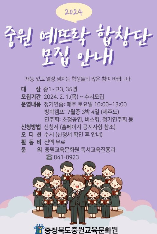 ![]() 중원교육문화원, 중원예(藝)뜨락합창단 3기 단원 모집 |