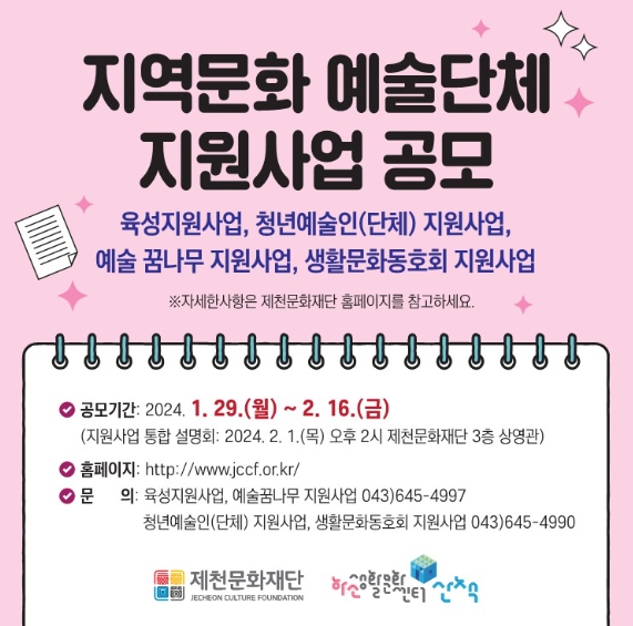 또한 문화재단은 예술단체의 편의와 이해를 높이기 위해 지원사업별 통합 설명회를 2월 1일 오후 2시 제천문화재단 3층 상영관에서 개최하며, 올해 공모사업에 대한 이해를 돕기 위해 변경 사항 및 지원 방향 등을 안내한다.