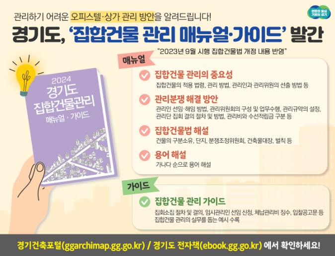 경기도는 집합건물 관리 종합지침서인 집합건물 관리 매뉴얼‧가이드를 시군 집합건물 담당 부서, 집합건물 관리단 등에 책자로 400부 배부할 예정이다. ‘경기건축포털’과 ‘경기도 전자책’ 누리집에도 파일로 게재해 누구든지 집합건물 관리에 적극 활용할 수 있도록 한다.