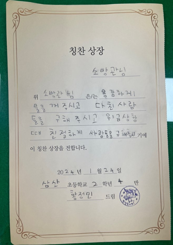 상장에는 서툰 손 글씨지만 한 자 한 자 마음을 담아 “소방관님은 용감하게 불을 꺼주시고”, “다친 사람들을 구해주시고 위급상황 때 친절하게 사람들을 구해주시기에 이 칭찬 상장을 전합니다”라고 적혀있었다.