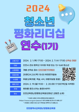 ![]() 인천광역시교육청난정평화교육원, 청소년 평화리더십 연수 1기 참여자 모집 |