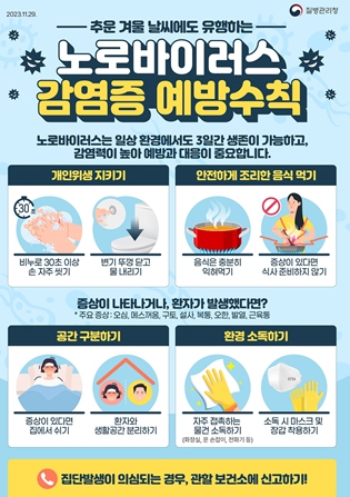 노로바이러스와 같은 수인성·식품매개 감염병을 예방하기 위해서는 ▲30초 이상 올바른 손씻기 생활화 ▲채소·과일은 흐르는 물에 깨끗이 씻어 먹고, 껍질 벗겨 먹기 ▲음식물 충분히 익혀 먹기 ▲끓인 물 마시기 등의 위생수칙을 준수해야 한다.