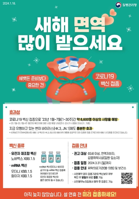 장연국 소장은 “가족, 친지 등 모임이 잦은 설 명절을 앞두고 65세 이상 고령층, 요양병원‧시설과 같은 감염취약시설 입소자‧종사자, 감염 시 중증‧사망 위험이 높은 기저질환 보유자는 반드시 접종에 동참해 달라”고 당부했다.