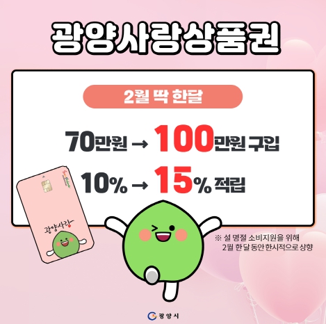 현재 광양사랑상품권은 충전형 카드로 1인당 구매 한도를 70만 원으로 제한하고, 사용한 금액의 10%를 캐시백으로 돌려주는 방법으로 운영 중이다.