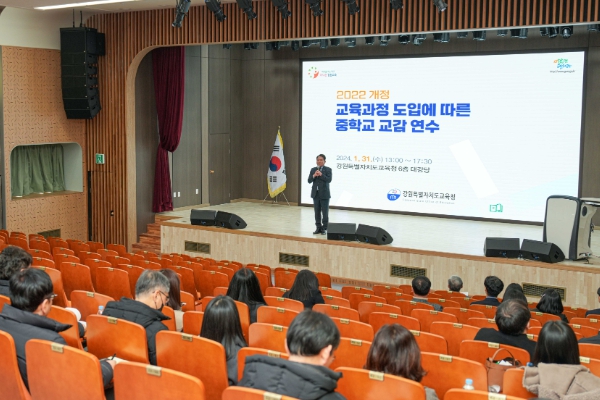 2022 개정 교육과정의 안정적인 도입을 위해 실시하는 이번 연수는 △2022 개정 교육과정 개정의 방향 △2022 개정 중학교 교육과정 변화의 중점 사항 △학교자율시간 운영 사례와 학교 교과목 만들기를 주제로 진행했다.