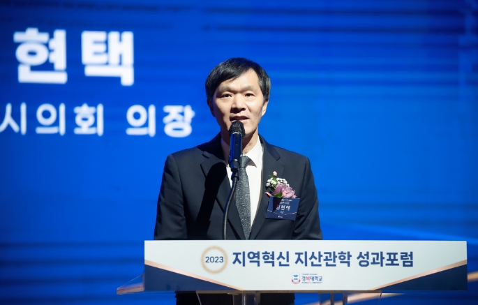 ![]() 김현택 의장이 지역혁신 지산관학 성과포럼에서 축사하고 있다. |