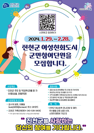 모집 대상은 진천군에 주소를 두고 있거나 직장(학교)이 있으면서 평소 여성복지와 관련된 정책에 관심이 많은 사람으로 여성친화도시 조성을 위해 열정적으로 활동할 수 있는 사람이면 누구나 가능하다.