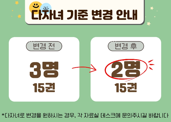 지난해 ‘충청북도 인구정책 기본 조례’ 개정에 따라 2명 이상의 자녀를 출산 또는 입양하여 양육하는 가정이 ‘다자녀’로 규정됐다. 이에 따라 시립도서관에서도 양육 친화적 환경 조성을 위해 다자녀의 기준을 2명으로 확대했다.