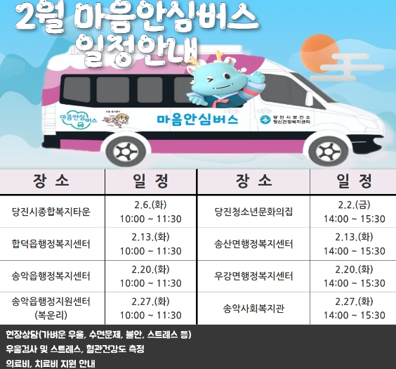 마음 안심 버스에서는 스트레스나 우울, 불안 등 자신의 심리상태를 알 수 있으며 정신건강 전문가가 들려주는 심리상담을 받을 수 있다. 또한 뇌파-맥파 측정 결과를 기반으로 두뇌 건강과 스트레스 상태를 검진할 수 있다.