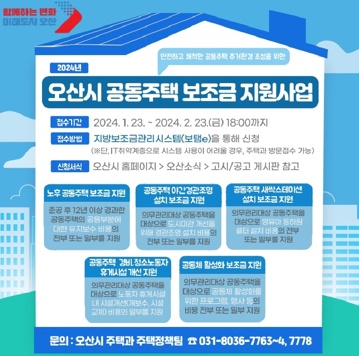 보조금 사업에 참여를 원하는 공동주택에서는 2월 23일까지 신청서 및 관련 서류를 준비하여 지방보조금관리시스템(보탬e)을 통해 신청하면 되고, IT 취약계층에 한해 오산시 주택과로 방문 신청할 수 있다.