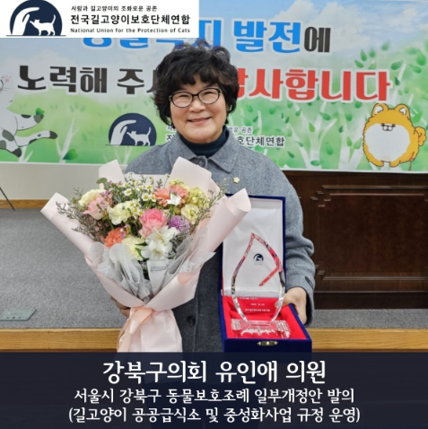 강북구의회 유인애부의장(번1․2동, 수유2․3동)은 지난 1월 26일 전국길고양이보호단체연합(대표 오경하)로부터 감사패를 받았다.