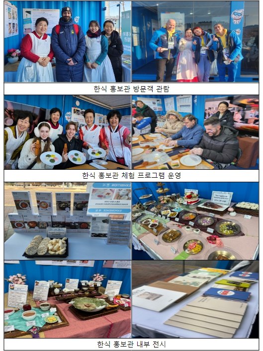 한식 홍보관은 강원 동계 청소년올림픽을 방문하는 선수단(1,900여 명)과 관람객들에게 다채로운 한식 문화와 매력을 보여주기 위해 마련됐으며, 발효·사찰 음식 등을 주제로 한 영상·도서 홍보와 전통 다과 만들기 체험 프로그램으로 구성됐다.