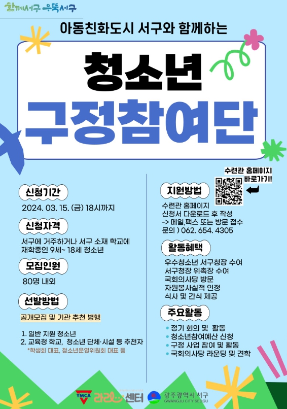 구정참여단 신청은 오는 3월15일까지 서구청 홈페이지나 서구청소년수련관‘라라센터’홈페이지에서 신청서를 다운받아 이메일 또는 서구청 아동청소년과로 방문 접수하면 된다.
