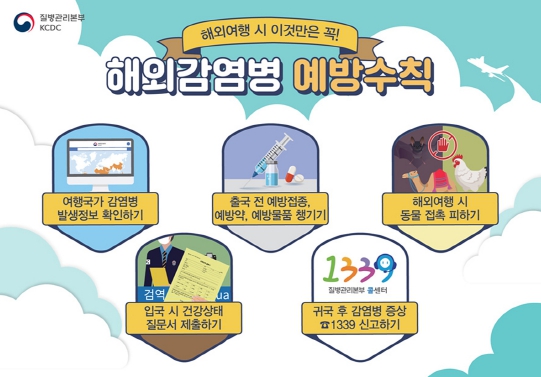또한 연휴 중 해외여행을 계획하고 있다면 여행 전 방문 국가의 감염병 정보를 확인하고 여행 중 음식과 물을 주의해서 섭취하고 모기에 물리지 않도록 주의해야 하며 여행 후 증상 발생 시 신속히 관할 보건소 및 질병관리청 콜센터에 신고하고 의료기관 방문 시 해외여행력을 미리 알려야 한다.