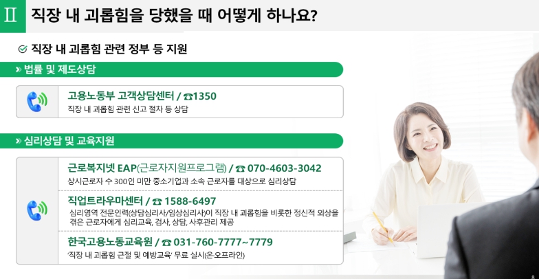먼저, 사업장 자체 직장 내 괴롭힘 예방 교육에 활용할 수 있도록 근로자에게 꼭 필요한 정보를 담은 「근로자용 교육자료」와 사용자가 꼭 알아야 하는 「사용자용 교육자료」를 PPT와 동영상으로 각각 제작·보급*한다. 동 교육자료는 고용부·교육원 홈페이지에서 다운받을 수 있다.