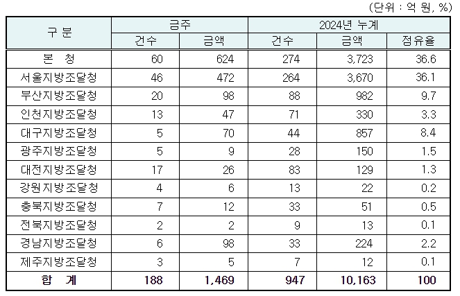 지역별 발주량을 보면 대전광역시 소재 본청 624억 원, 서울지방청 472억 원 등 2개청(1,096억 원)이 전체 금액(1,469억 원)의 74.6%를 차지하고 있으며, 인천 등 나머지 10개 지방청 373억 원이 각각 집행될 예정이다.