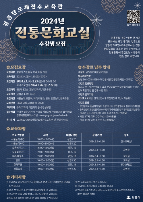 ![]() 2024년도 강릉단오제전수교육관 전통문화교실 수강생 모집 |