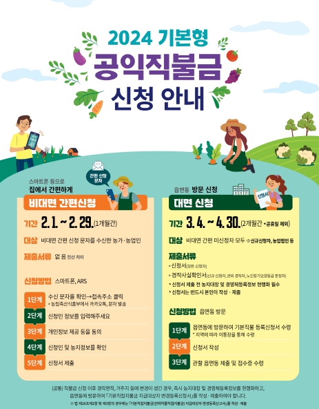 지난해 공익직불금 등록 정보와 올해 농업경영체 등록 정보에 변동이 없는 비대면 간편 신청 대상 농업인은 스마트폰, ARS로 2월 29일까지 비대면 신청이 가능하다.