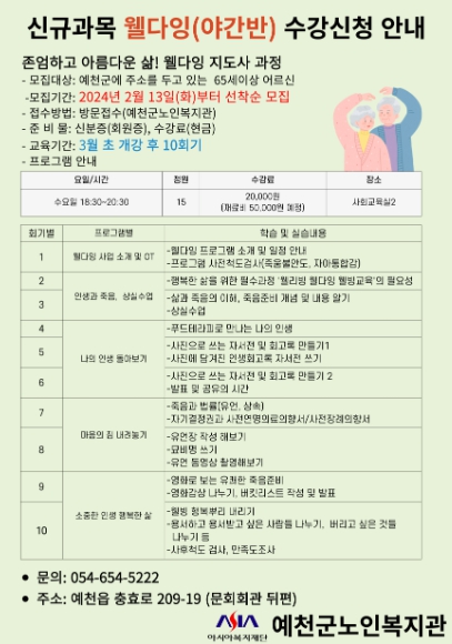 새로 개설되는 프로그램은 매트필라테스, 웰다잉, 실버합창단으로 2월 13일부터 모집한다. 매트필라테스는 오후에, 평안한 삶의 마무리를 의미하는 웰다잉(Well-dying) 프로그램은 야간에 개설할 예정이다.