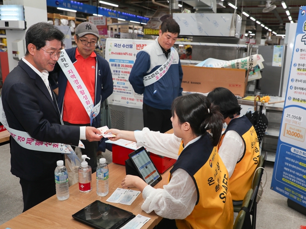 중마시장은 국내산 수산물과 농축산물에 대해 당일 구매기준으로 ▲3만4천원 이상은 1만원 ▲6만8천원 이상은 2만원을 온누리상품권으로 행사 기간 품목별 각각 1회에 한해 지급한다. 광영상설시장은 국내산 수산물과 별도로 전 품목 구매 고객에게도 동일하게 추진한다.