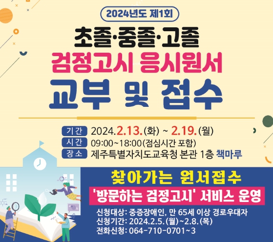 이번 검정고시는 2024년 4월 6일에 실시하며, 오는 2월 13일부터 2월 19일까지 5일간 도교육청 책마루와 서귀포시교육지원청 민원인쉼터에서 원서 교부 및 현장접수가 이루어진다. 원서접수 창구는 09:00 ~ 18:00까지 운영하며, 점심시간에도 접수창구를 운영하여 점심시간 외 원서접수가 어려운 검정고시 지원자들에게 편의를 제공할 예정이다.