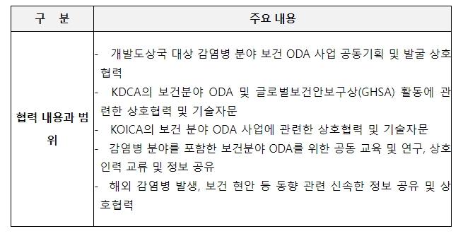 이번 양해각서의 개정을 통해 양 기관은 ▲개발도상국 대상 보건 공적개발원조 사업에 대한 공동 기획 및 상호 협력을 시행하고, 특히, ▲팬데믹 대비 해외 감염병 발생, 보건 현안 등 동향 관련하여 신속한 정보를 공유하는 데까지 협력 범위를 넓혀 나가기로 했다.
