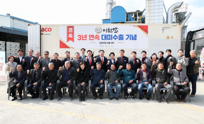 2월 2일 이천시 신둔농협 미곡종합처리장에서 진행된 대미 쌀 수출 기념식에는 김경희 이천시장, 송석준 국회의원, 김하식 이천시의회 의장, 도, 시의원, 그리고 김현수 농협중앙회 이천시지부장을 비롯해 황순철 모가 농협조합장, 정하용 신둔 농협조합장 및 조합원, 윤희동 농업기술센터소장과 관계공무원, 농민단체 등이 참석해 이천 쌀의 3년 연속 대미 수출을 축하하는 자리에 함께 했다.