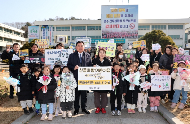 이번에 마련된 기부금은 산들바람 어린이집 원아들이 지난 1월 19일 원내에서 아나바다 시장놀이를 통해 마련한 수익금으로 전달식에는 김산 군수, 산들바람 어린이집 원아와 부모, 교직원 등 40여 명이 참석했다.