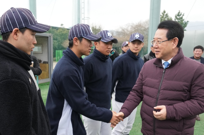 ![]() 김영록 전라남도지사가 2일 오후 보성군 회천생태공원 야구장을 방문, 2024년 동계 전지훈련을 하고 있는 의정부 상우고등학교 야구 선수단을 격려하고 있다. |