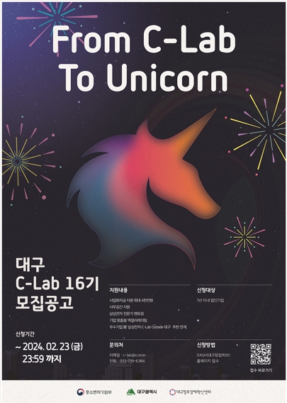 ![]() 유니콘을 꿈꾼다면, 대구 C-lab 엑셀러레이팅 프로그램에 참여하세요! |