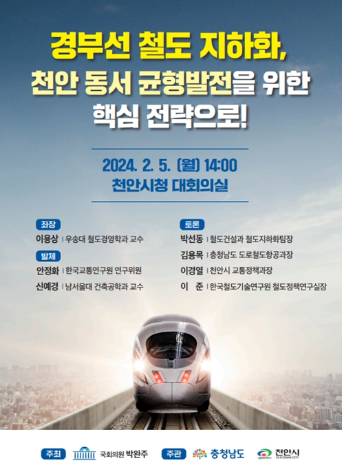 이같은 상황에서 천안 유일의 3선 중진인 박완주 의원이 천안과 더불어 충청 전체 발전을 위한 철도 지하화 추진 전략 마련을 위해 오는 5일 월요일 오후 2시 천안시청 3층 대회의실에서 '경부선 철도 지하화, 천안 동서 균형발전을 위한 핵심전략으로'정책 토론회를 개최한다.