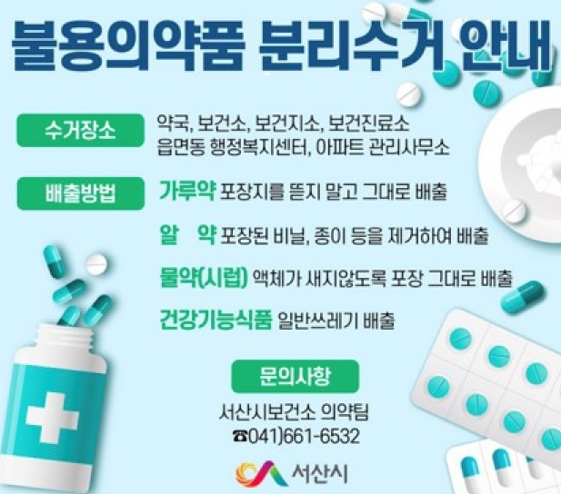 서산시 김용미 보건소장은 “불용의약품이 일반쓰레기나 하수구를 통해 버려질 경우 토양과 수질을 오염시키고 오래된 의약품의 오‧남용은 우리의 건강도 위협할 수 있다”며 “시민들이 올바른 불용의약품 분리배출 방법을 인식하고 실천할 수 있도록 홍보를 강화해 나가겠다”고 말했다.
