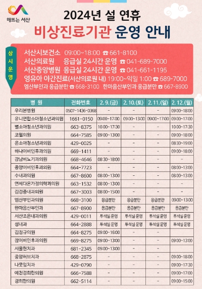 ![]() 2024년 설 연휴 비상진료기관 운영 안내 홍보물 |