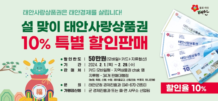 군은 2월 한 달간 기존 5%던 태안사랑상품권 할인율을 10%로 올리고 할인한도도 기존 30만 원에서 50만 원(지류·카드·모바일 합산)까지 상향해 판매한다고 5일 밝혔다.