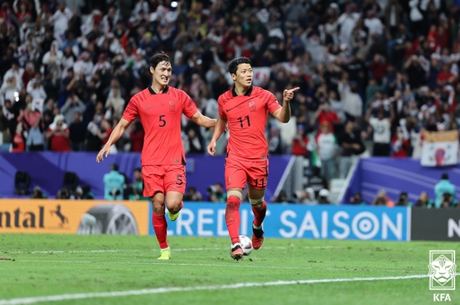 ![]() 호주와의 아시안컵 8강에서 후반 종료 직전 황희찬(오른쪽)이 페널티킥으로 극적인 동점골 기록 후 기뻐하고 있다. |