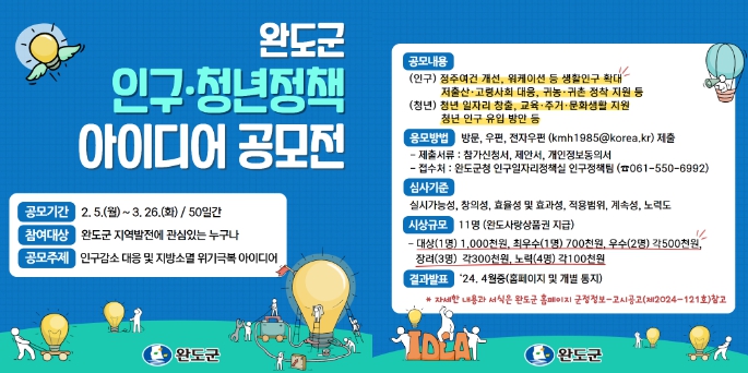![]() 완도군, 인구감소 대응 '인구·청년 정책 아이디어 공모' |